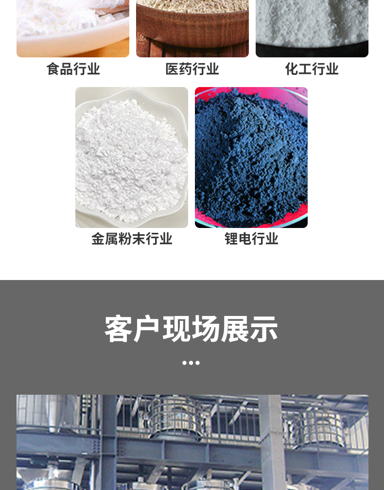 磷酸鐵鋰、三元材料、石墨、多晶硅、單晶硅、糖粉、淀粉、食鹽、米粉、奶粉、豆?jié){、蛋粉、醬油、果汁、茶、沖飲、乳品、糖果、小食品、速凍食品、調(diào)味品、蛋白、食品添加劑、工業(yè)藥品、中藥粉、顆粒藥丸、微丸、樹脂、涂料、化妝品、油漆、鋁粉、鉛粉、銅粉、礦石、合金粉、焊條粉末、二氧化錳、電解銅粉、電磁性材料、研磨粉、耐火材料、高嶺土、石灰、氧化鋁、重質(zhì)炭酸鈣、石英砂、廢油、廢水、染整廢水、造紙、助劑、活性炭等。