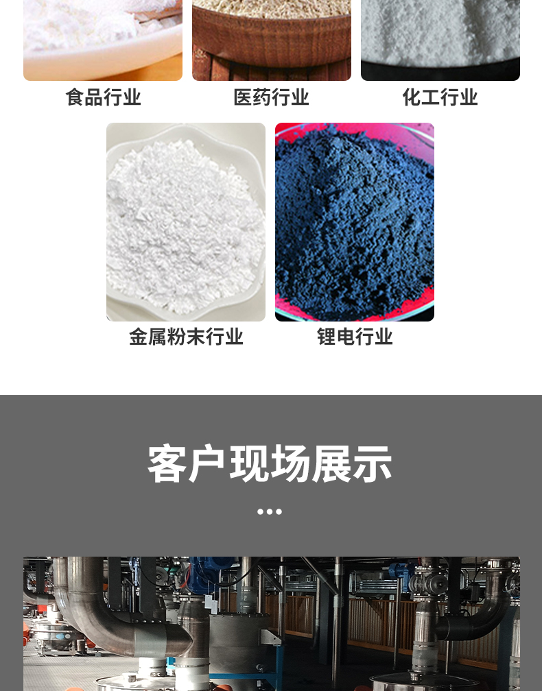 面粉、淀粉、奶粉、添加劑、炭黑(白炭黑)、石英粉(砂)、云母、熒光粉、長(zhǎng)石粉、高嶺土、硅黑土、粉煤灰、玻璃微珠、環(huán)保、塑膠、塑料、磁材、建材、礦山、窯業(yè)、飼料、調(diào)味品、魚(yú)粉、米粉、面粉、豆粉、奶粉、蛋粉、淀粉、砂糖、果汁、西藥粉、中藥粉、醫(yī)藥中間體、珍珠粉、純堿、聚乙烯、樹(shù)脂粉(PVC、環(huán)氧)、洗衣粉、助劑、油漆、染料、顏料、橡膠、涂料、合金粉、金粉、銀粉、銅粉、鋁粉、鎳粉、鉻粉、鎂粉、鋅粉、鋇粉、釩粉、鈦粉、鍶粉、鉛粉、鑄造砂等。